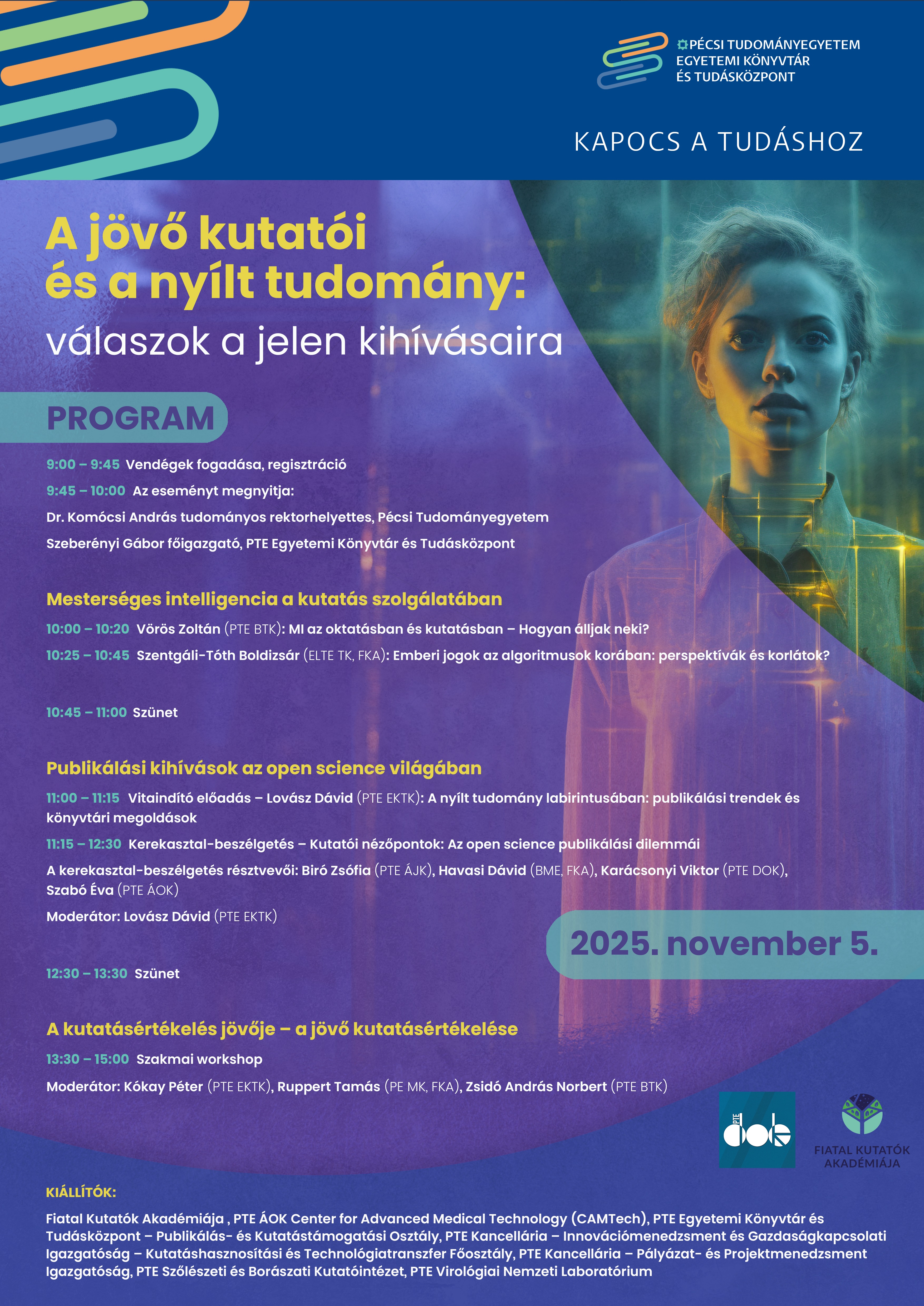 Az esemény középpontjában az Open Science aktuális kérdései, a mesterséges intelligencia tudományos szerepe, valamint a tudományos publikálás és kutatásértékelés új szempontjai állnak.