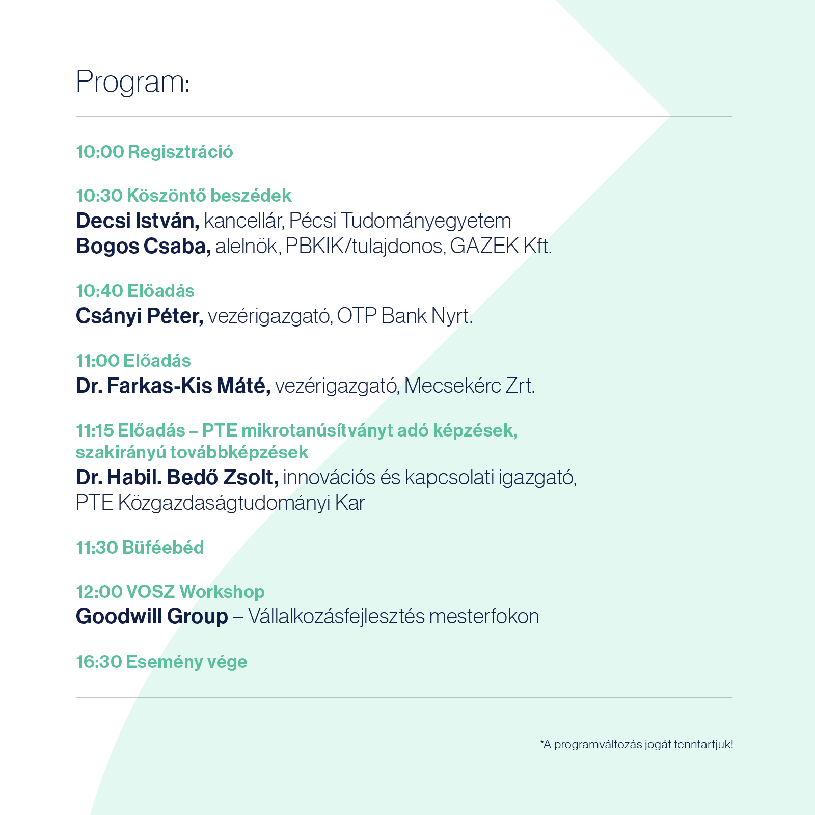 Ezt követően dr. Farkas-Kis Máté, a Mecsekérc Zrt. vezérigazgatója a nagyvállalatok vezetésének kihívásairól beszélt, majd dr. Bedő Zsolt, a PTE Közgazdaságtudományi Kar innovációs és kapcsolati igazgatója ismertette az egyetem mikrotanúsítványt adó képzéseit és szakirányú továbbképzéseit. A programot a VOSZ workshopja zárta, Goodwill Group – Vállalkozásfejlesztés mesterfokon címmel.