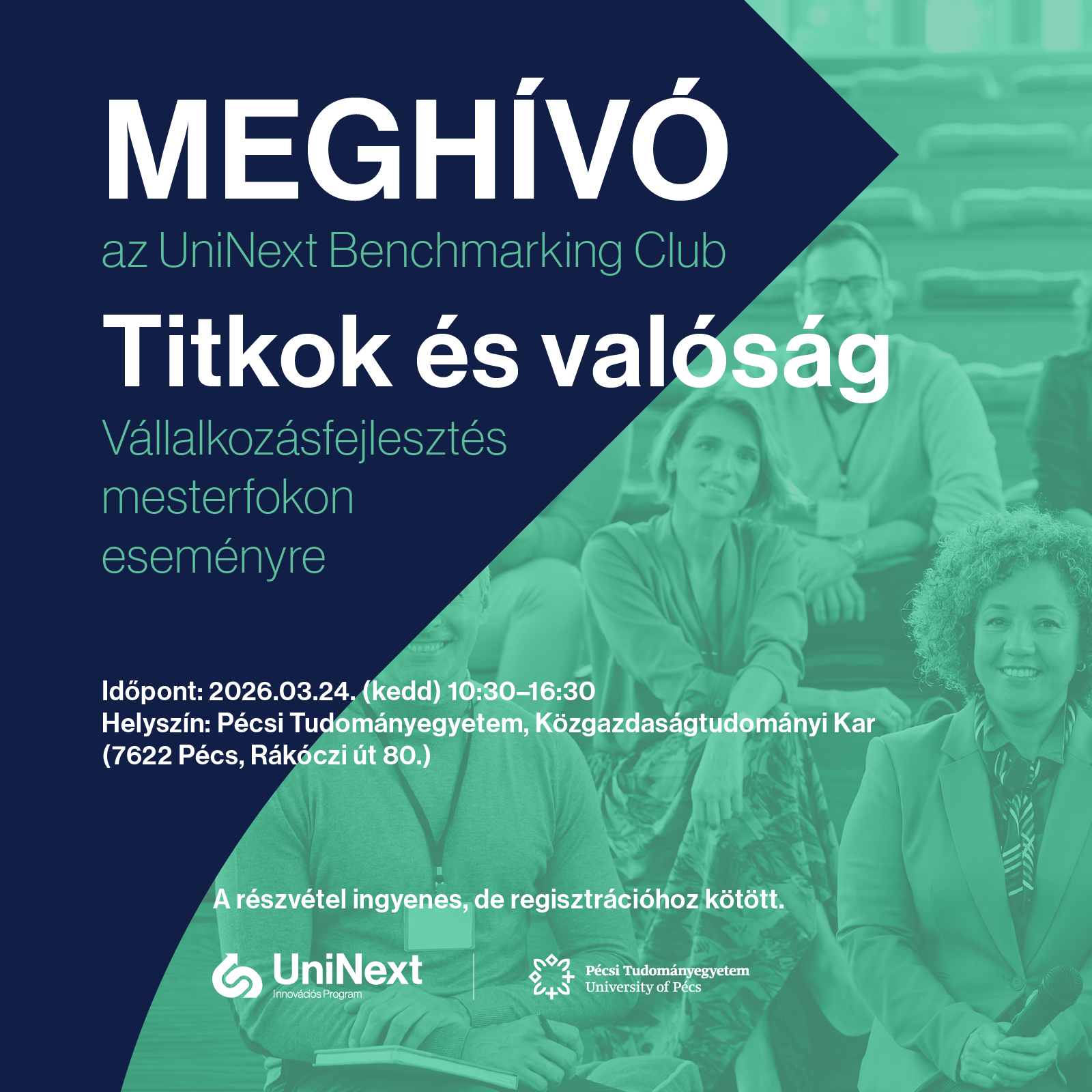 Március 24-én a Pécsi Tudományegyetem Közgazdaságtudományi Karán rendezték meg az Uninext Benchmarking Club első eseményét „Titkok és Valóság – Vállalkozásfejlesztés mesterfokon” címmel. Az esemény fókuszában a vállalkozásfejlesztés aktuális kérdései és jó gyakorlatok álltak.